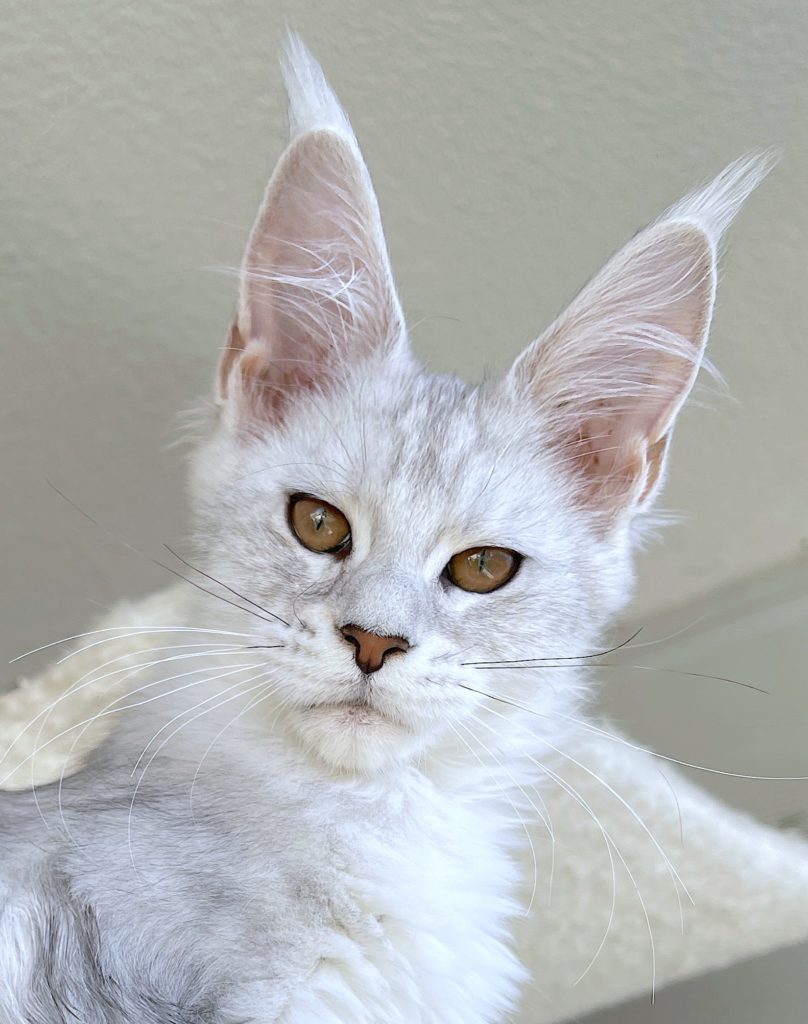 Ma couleur est black tortie silver blotched tabby et blanc bicolore. J’ai une couleur fantastique et un très grand box. Je me développe super bien. J’ai un excellent museau carré, de très grandes oreilles haut placées ornées de lynx tips.